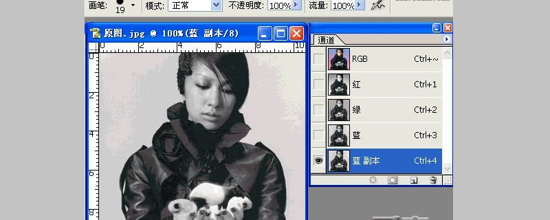 依据图片选择对比明显的颜色,如图选择蓝色,再开启并调整“色阶”,利用颜色对比将图中的背景人物和背景分离出来,或者直接输入色阶“135/1.00/195.”此时图片基本已经变成黑白,用画笔将人物整体涂成黑色就可以了。