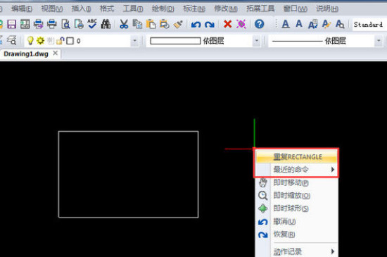 鼠标右键其实也可以设置快捷方式,但是能满足的条件比较复杂。首先必须是刚才操作过的命令,否则需要在快捷选项的菜单中更改命令选项。因此利用鼠标右键来重复操作命令,只需点击“重复RECTANGLE”即可。