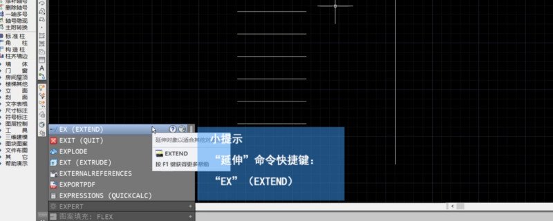 cad里面的延伸命令,其实就是延伸快捷键的使用方法,cad中含有很多操作快捷键,其中延伸的快捷键就是EX。快捷键的操作方法一般都很简单,如果不需要数值,那么将快捷键输入指令栏就可以了。