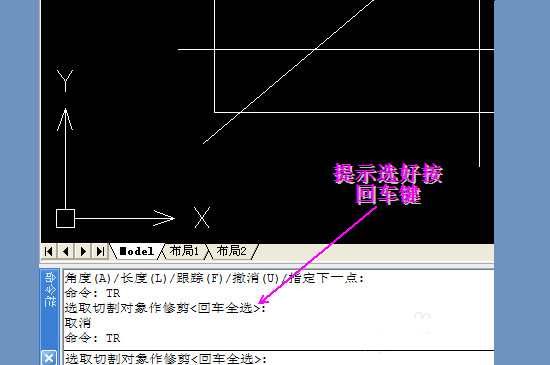 快捷键TR的用处很多,不仅可以剪切绘制过程中多于的线条,还可以将杂线、不需要的线剪切出去。如果要剪切很多目标的话,可以先选取全部之后再按回车键,就可以剪切所有目标了。