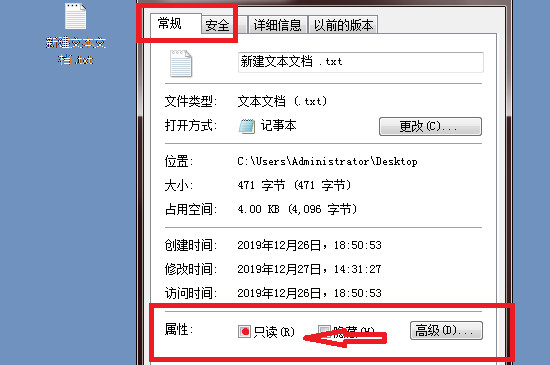 打开之后会弹出一个会话框,里面是文本文档的详细设置属性,点击常规一栏,找到最下面的“属性”,就可以看到有两个选项:已读和隐藏,一般的文本文档都是默认取消选择的,因此把只读勾选好之后确定即可。