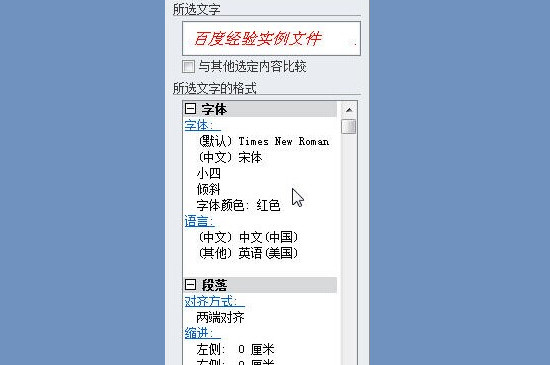 完成全部设置后,回到文档页面,在工具栏中找到“快速访问工具栏”这一选项,选择“显示格式”按钮。选择后可以看到“显示格式”的窗口里可以看到被选中的文字格式,包括字体、段落、节等细节设计详情。