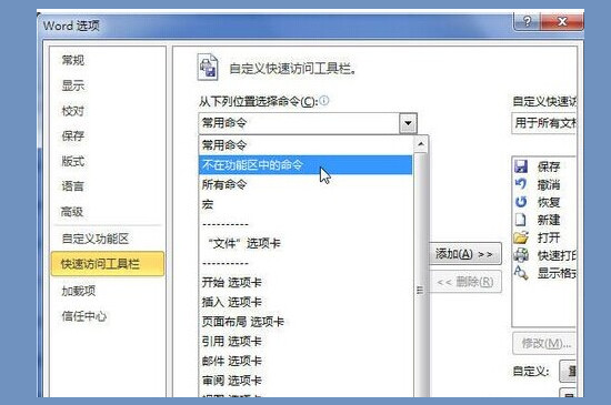 打开后找到“从下列位置选择命令”这个选项,下拉选项找到“不在功能区中的命令”,设置好之后找到“显示格式”并打开,点击“添加”按钮,可以看到文件默认选项显示“用于所有文档”,点击确定即可。