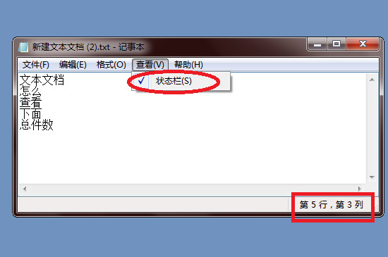 下一步是找到工具栏中的“查看”,选择其中的“状态栏”,如果自动换行没有取消,可以看到状态栏这里是灰色的,属于不可选。勾选状态栏后,将光标选择好,就能在文本文档右下角看到目前的行列数。