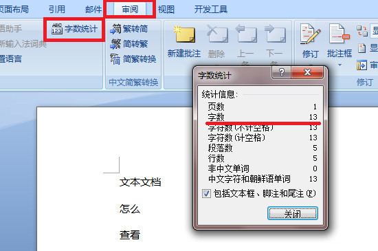 不过这样只能看到文本文档的行列数,想要查看字数还是需要借助其他工具。将文本文档的文字全部复制后,粘贴到word文档,在工具栏中找到“审阅”后点击字数统计,不仅能查看行还能看到字数。