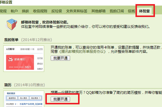 电脑版的qq邮箱是可以制作简历的,将qq邮箱打开找到“设置”,打开后点击最后一个选项“体验室”,下拉就可以看到简历的功能,不过此时是默认关闭的,点击一下“我要开通”就可以使用了。