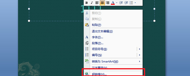 首先将ppt打开,选择超链接关联的文字,注意此时这个文字是没有任何改变的。点击幻灯片让文字进入编辑模式,点击右键后,找到并选择“超链接”选项,就可以打开会话框进行关于超链接的设置。