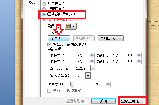 更改完毕后会发现下面的选项多了一个“文件”,点击“文件”将保存好的背景图插入,注意格式要是“.jpg”的才可以,插入后点击“全部应用”,就可以看到这个背景图应用到所有的幻灯片里去了。