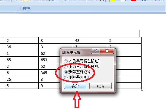 仔细浏览表格中的内容,对着想要删除的某一行,如:“63”开头的那一行,用鼠标点一下,然后右键打开“删除单元格”选项,此时弹出了会话框默认“右侧单元格左移”,调整改为选取删除整行后,点击确定选项就可以了。