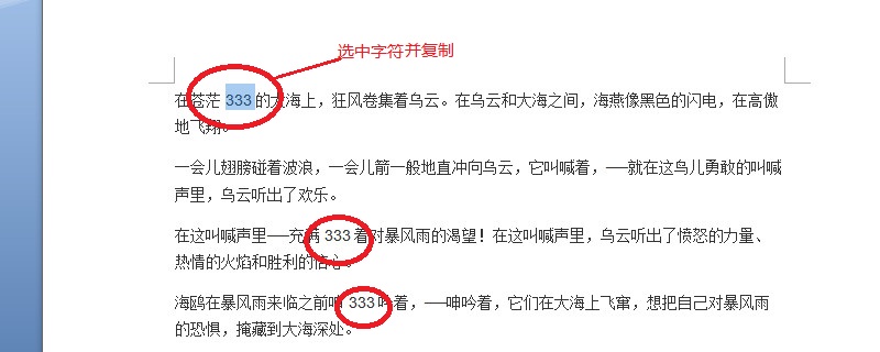 将word文档打开,把所有文本展示出来,选取想要删除的文字后,右键复制文字,或者使用快捷键Ctrl+C复制。如图,我将文本中随机添加了“333”字符,将“333”选取并复制就可以了,可以看到下面的文本中还有同样的字符。