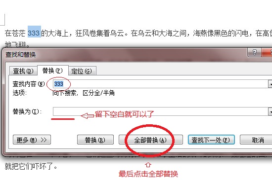 选中文字后,在word文档上面的“开始”选项中,找到最右边的替换,点击后会弹出来一个会话框,将查找内容改为选中的文字或者直接粘贴,如:333,“替换为”什么都不填写,留下空白即可,最后点击“全部替换”选项。