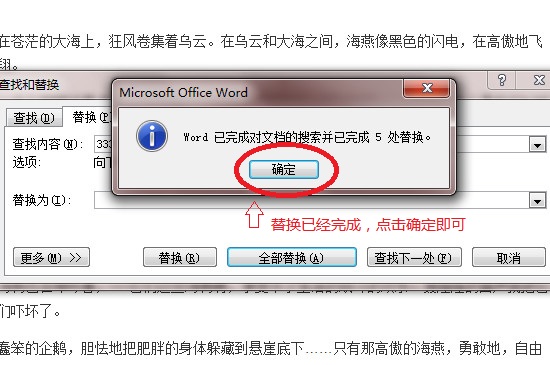 系统自动扫描之后,会弹出一个会话框,提醒是否从文章开头继续搜索,点击“继续”即可,最后会话框会显示已经完成替换,点击确定就可以了。如图,点击确定后可以看到本身存在的“333”字符已经被删除了。