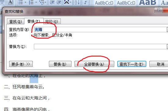 打开替换框之后,将查找内容复制进去,点击右键再选择粘贴选项,或者使用快捷键“Ctrl+V”,就可以把查找的内容放在选项中,下列的“替换为”选项,什么都不填写,直接是空白的就可以了,调整选项完毕之后,点击“全部替换”。