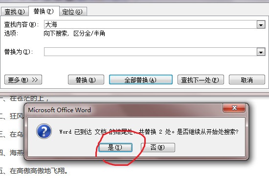 点击“全部替换”之后,系统会有一个提醒框,会告诉你已经替换了几个字符,以及提示是不是从开始继续搜索替换,点击“是”就可以了,最后系统会提示已经替换成功,点击“确定”即可,再查看文档发现重复已经删除。