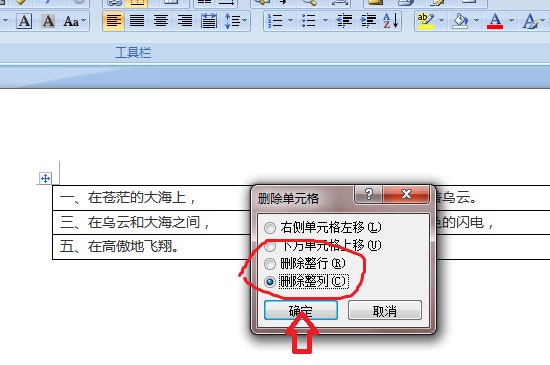 建立完成表格之后,可以看到文本变成了一个表格,其中偶数行现在都在右侧那一列,此时对着那一列点击鼠标右键,选择“删除单元格”选项之后,屏幕会弹出一个窗口,这时候要选择“删除整列”,然后再点击确定就可以了。