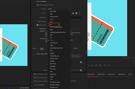 2. 在“导出设置”中面板中将视频的导出格式切换为“AVI”。