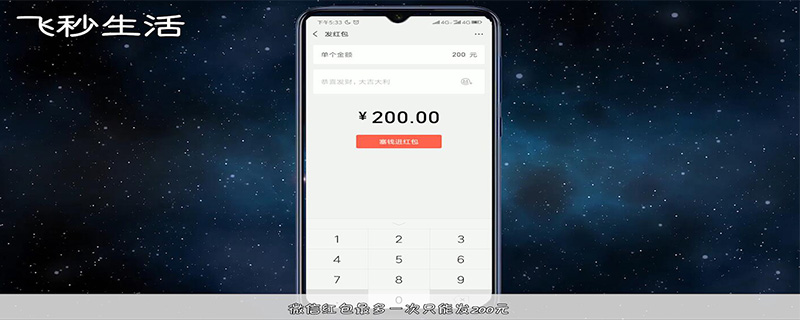 微信红包一次最多能发200元,添加了银行卡的用户,一张卡一天上限为15000元,在微信群中红包上限为20000元,一次最多能发100个。
