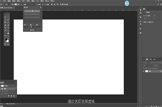 选择矩形工具,将选项调整为形状,填充改成无填充,描边改成纯色描边,像素改成3或5,描边选项选择虚线,这时就可以画出虚线,也可以选择直线工具画出直的虚线,或选择或选择自定义形状使用里面的形状画出想要的虚线