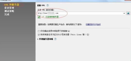 4、在扫描配置向导中,URL和服务器中,输入起始URL,然后点击“下一步”。