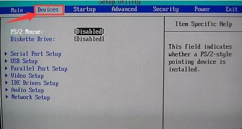 1、根据电脑开机画面提示,按相应快捷键进入bios界面,在bios界面中将光标移动到devices选项。