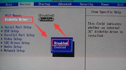 2、用↓键选择diskettedrive回车,然后在弹出的小窗口中选择disabled回车。
