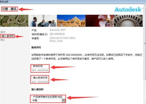 1、首先进入注册激活输入邀请码界面,新序列号和确认新序列号输入111-11111111,产品使用者所在的国家/地区选择中国。