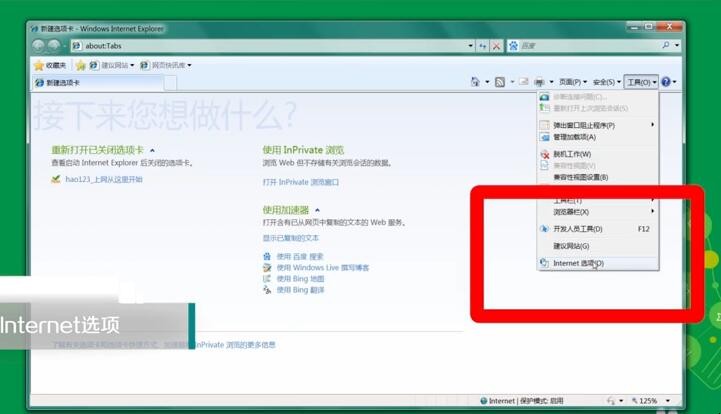 1、打开IE浏览器,点击“设置”,选择“Internet选项”。