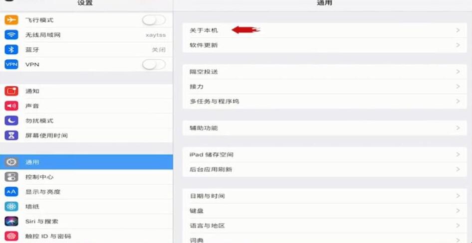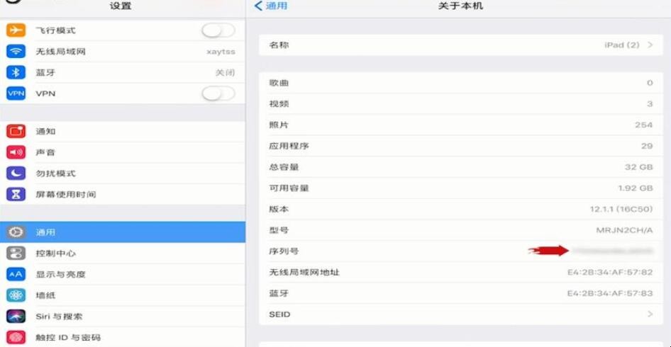 2、在“关于本机”页面可以看到ipad版本,查看序列号并记下来。