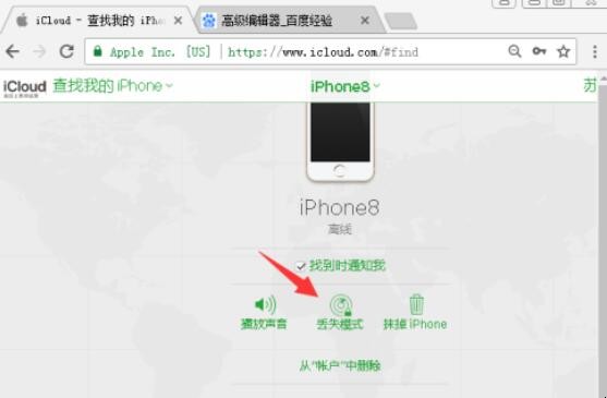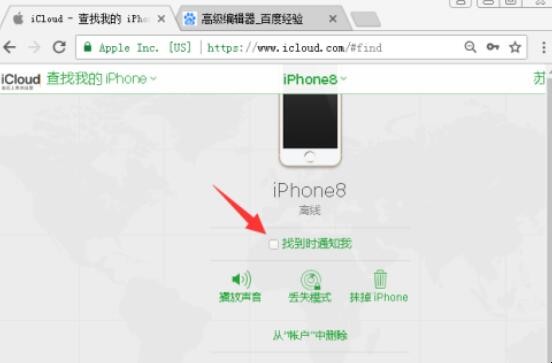 3、接着我们可以看到所定位的iPhone显示离线,如果iPhone是离线状态的话,在定位时是无法查找到iPhone目前所在位置,需要等待离线的iPhone联网以后,才能定位到位置,不过,您可以尝试以下方法操作进行找回,点击离线的iPhone手机,勾选一下找到后通知。