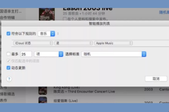 2、在使用ipod的时候,都会先登录和设置设备的苹果ID,此时将电脑上也下载iTunes之后登录相同的ID。打开iTunes之后在音乐播放列表中,选择“新建智能播放列表”,此时会弹出来一个窗口,根据窗口来选择对应的要求。