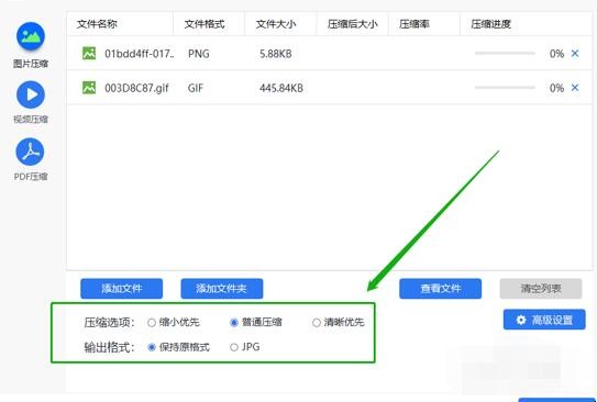 3、在添加文件的下面有压缩选项设置以及输出分辨率可以选择,根据自己的需要选择一个就好。