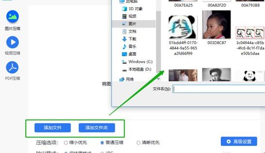 2、添加需要进行压缩的图片,点击添加文件或者添加文件夹的按钮,就可以选择文件,也可以直接拖拽文件添加。
