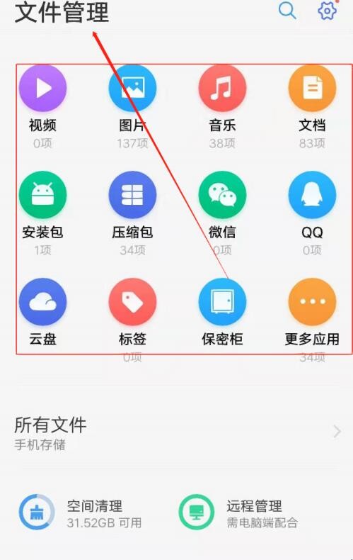 3、打开的页面即为文件管理,可以在此界面中管理手机所有文件,如下图所示: