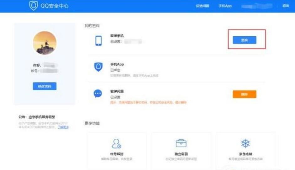 1、我们可以去选择更改密保手机,将密保手机设置为新手机号。我们打开QQ安全中心首页,登陆上自己的QQ号就可以看到密保手机选择,点击更改即可。
