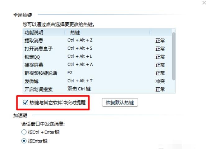 4、同时为了及时对热键进行冲突检测,建议勾选“热键与其它键冲突时提醒”项。