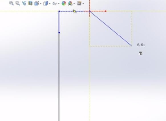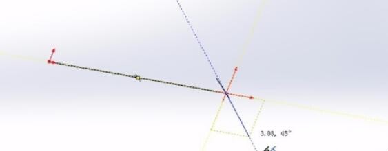 3、绘制第二条直线,长度大约3mm,与水平线成45度,可以在草图中看到45角度的虚线和参考长度值。不必太精确,我们后面会加几何关系。