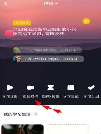 2、从菜单列表里找到“视频打卡”功能,我们就能够设置相关学习计划,并且以视频的方式记录学习过程!