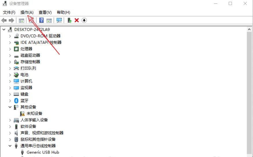 3、若无USBRootHub,我们点击设备管理器页面上方的操作,如图所示。