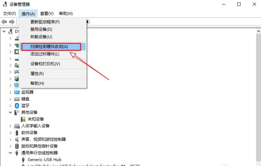 4、在展开的选项中,点击扫描检测硬件改动,这样USBRootHu就能重新下载回来了。