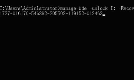 3、在命令行中输入manage-bde-unlock盘符号:-RecoveryPassword恢复密钥,例如:manage-bde-unlockI:-RecoveryPassword148918-294822-551727-016170-546392-205502-119152-012463,点击回车键。