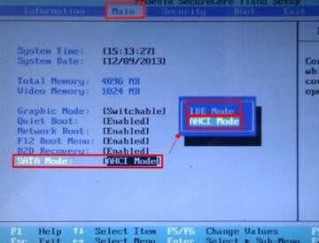 2、用键盘的上下左右键。移动到Main处,再用下键移动到SATAMode:AHCIMode处,按回车键,就可以看到该主板支持两种IDEMode、AHCIMode类型。