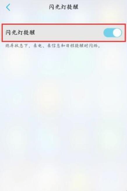 4、进去之后,看到第二栏闪光灯提醒旁边有个按钮的,把白色那个圈圈划到右边,这样就可以了,在息屏状态下,来电、来信息和日程提醒时,闪光灯会闪烁提醒。