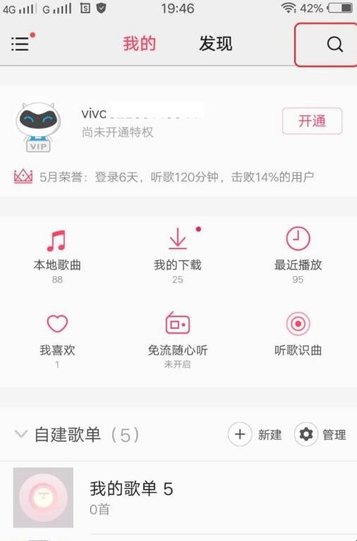 2、如图所示,进入我的音乐界面,点击右上角搜索图标。