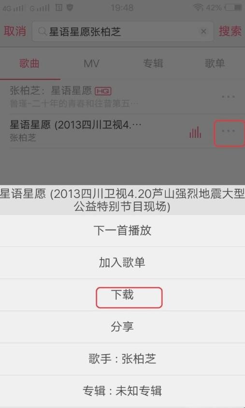 4、如图所示,点击歌曲后面的扩展按钮,会弹出菜单,在菜单里面选择下载就可以了,下载的歌曲会自动保存到手机存储里面的“i音乐”文件夹里面。