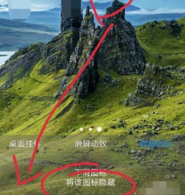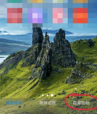 2、长按几秒过后手机的界面下方就会出现下图所示的一些操作功能选项了,其中就有一个设置隐藏图标的功能,然后我们点击它。