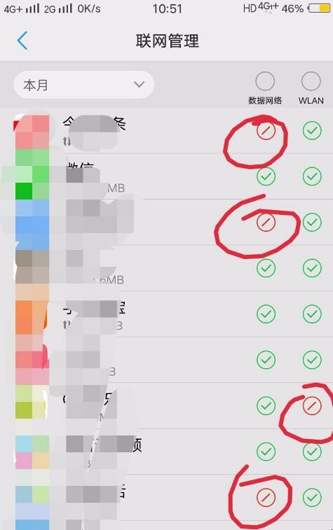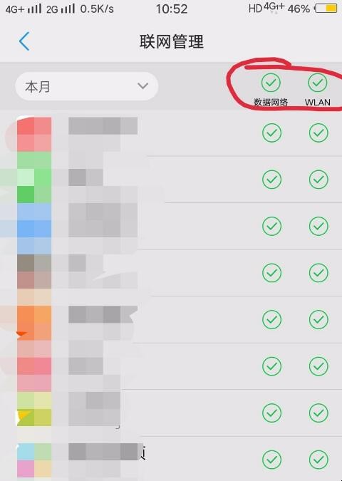 5、绿色表示开启,红色表示关闭,可能是有时候误操作把这个关闭了我们只要点击红色的即可!或者直接点顶部的全部打开就行了!当然你也可以根据自己的情况,选择哪些app不用数据流量,只在wlan无线下才能使用!