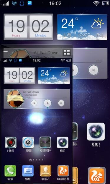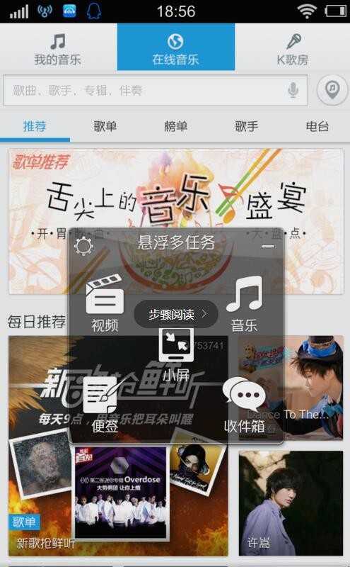 1、长按返回键,屏幕中央会出现悬浮多任务框。该悬浮框提供5个快捷方式:视频、音乐、小屏、便签和收件箱。