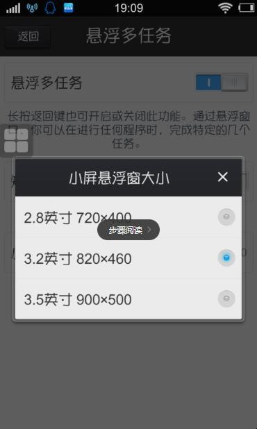 3、如果觉得小屏窗口过小或过大,可以返回之前的悬浮多任务框,点击框内左上角的设置图标,进入悬浮多任务设置界面,修改小屏悬浮窗大小。