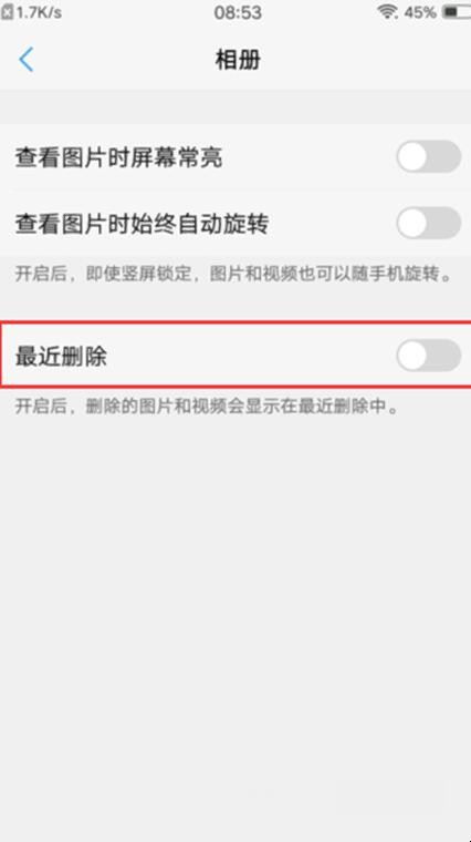 3、到了相册的面板之后,选取“最近删除”一栏,点击开启“最近删除”的开关按钮。