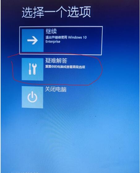 2、在蓝色的【选择一个选项】界面中选择【疑难解答】开始进行电脑重置或者其他一些高级选项。